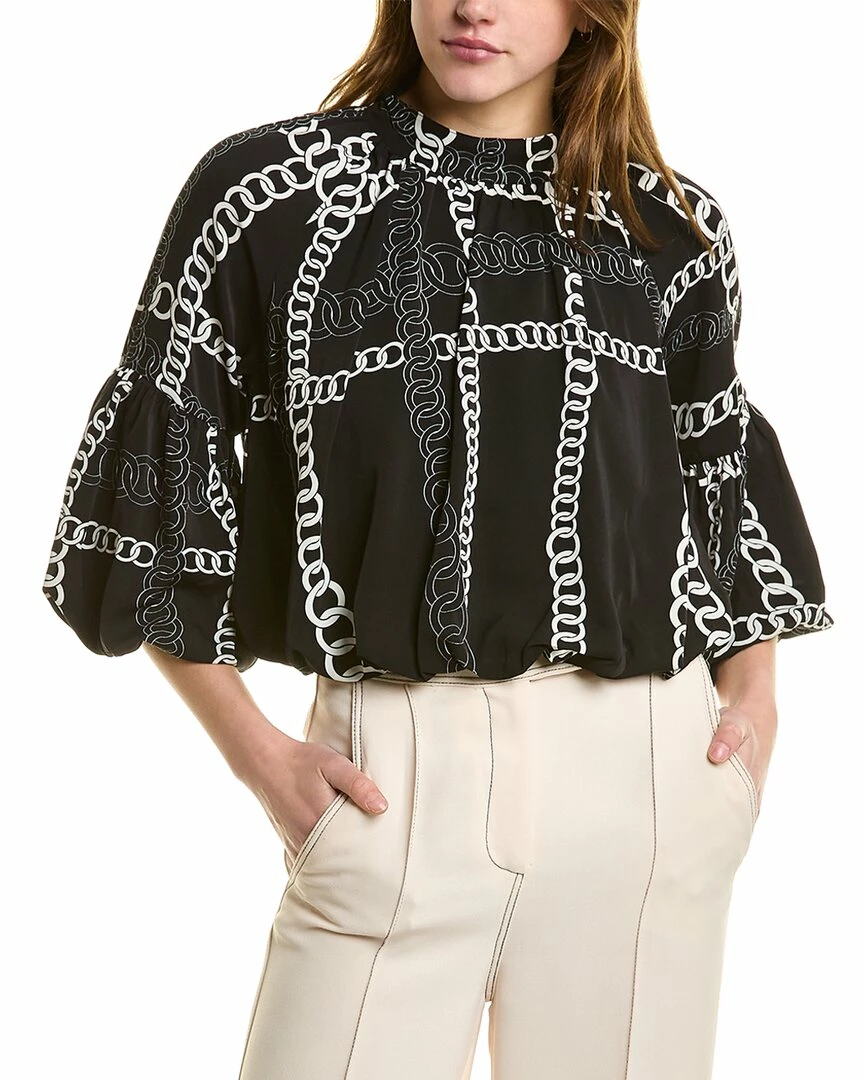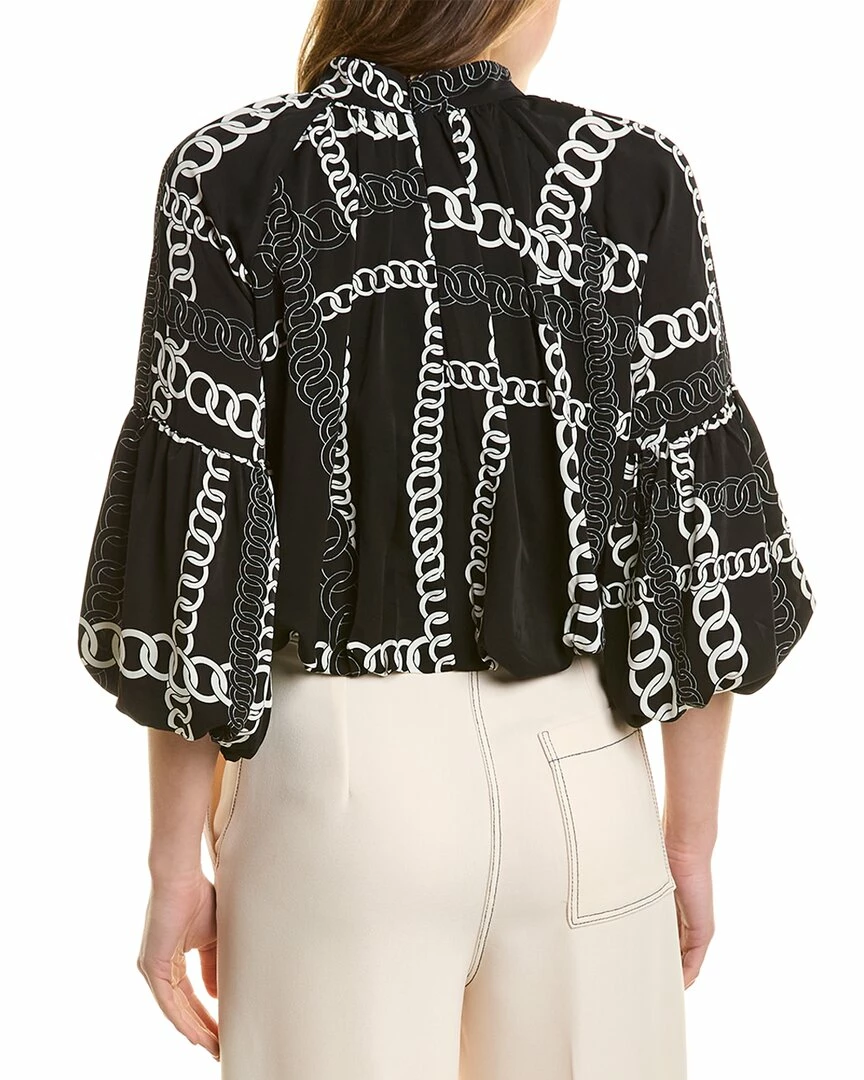 - Balloon Sleeve Blouse In Black & White With 3/4-Length Sleeves And Mock Neck