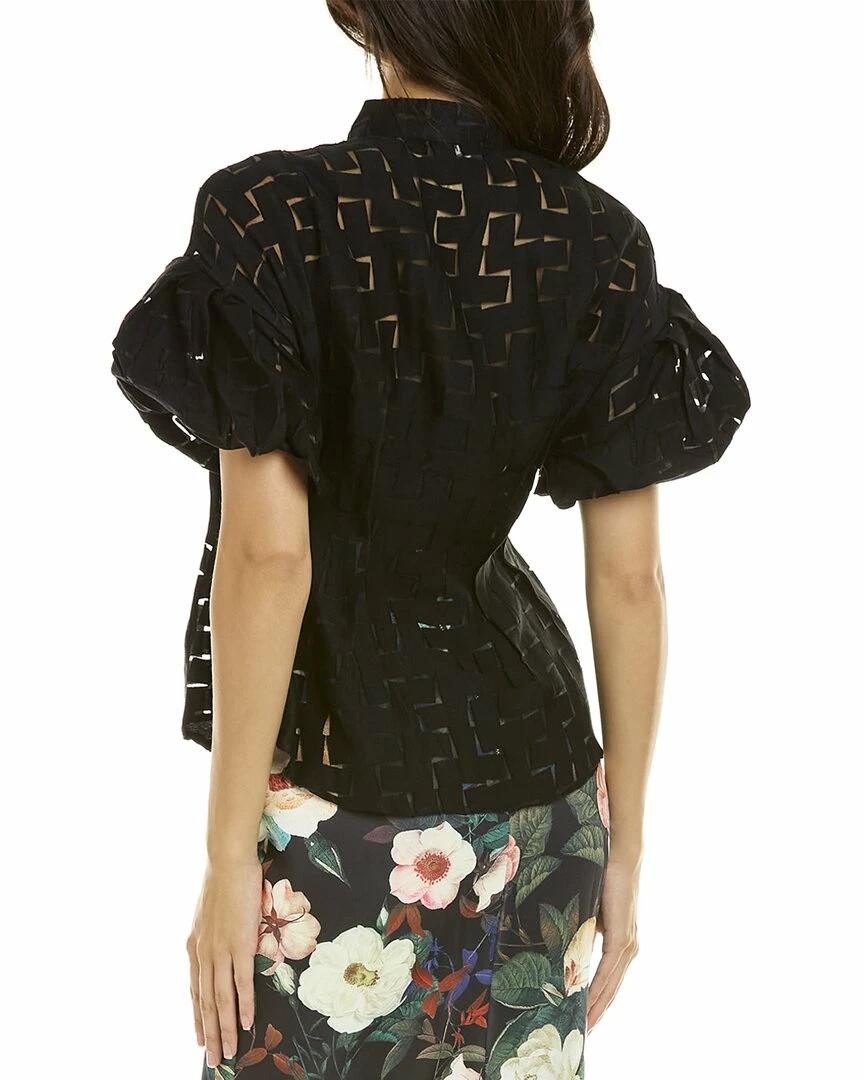- Button-Down Sheer Blouse In Black With Sheer Burnout Design, Pintuck Seaming And Pleated Puff Sleeves With Elasticized Cuffs
