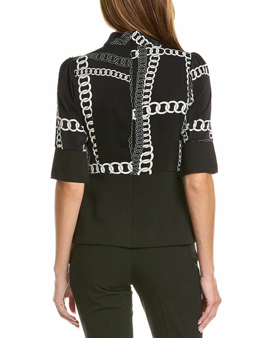 - Chain Print Blouse In Black With Mock Neck, Twisted Detail, Elbow-Length Sleeves, And Peplum Hem