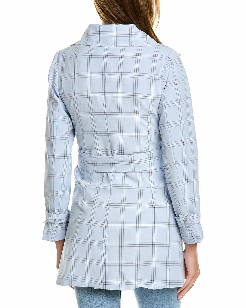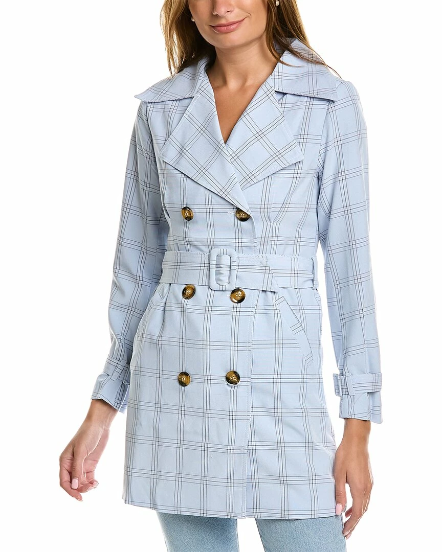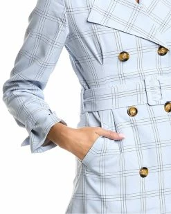 - Check Trench Coat In Blue With Pleated Detailing, Buckle Straps At Cuffs, Side Seam Pockets, Belted Waist, And Center Back Vent At Hem