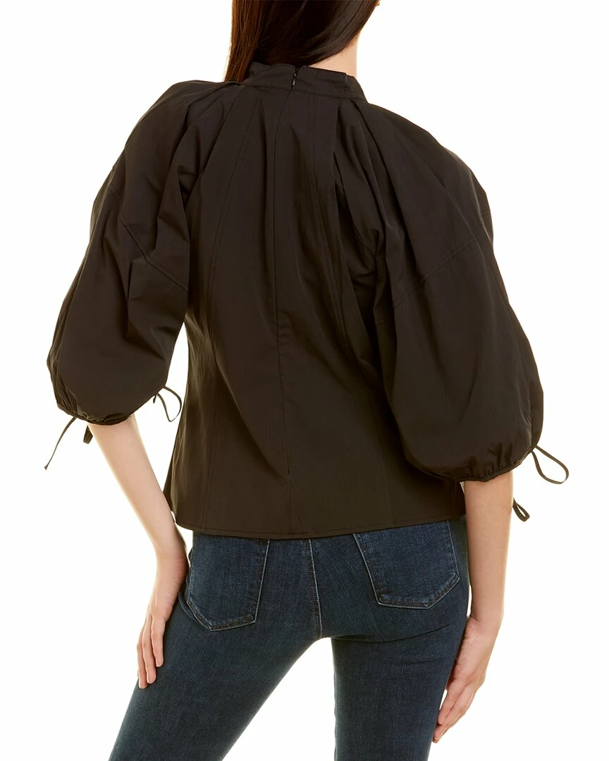 - Cinched Sleeve Top In Black With Stand-Up Collar And Pleated Neckline