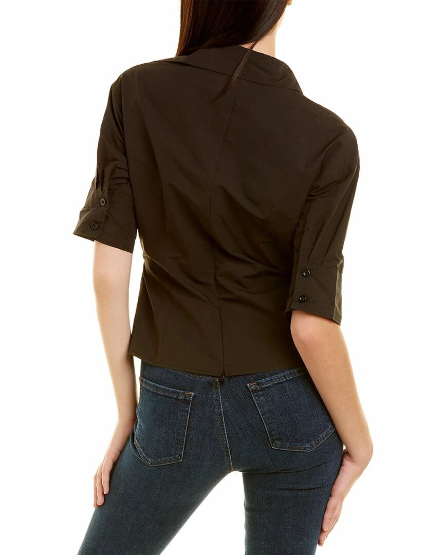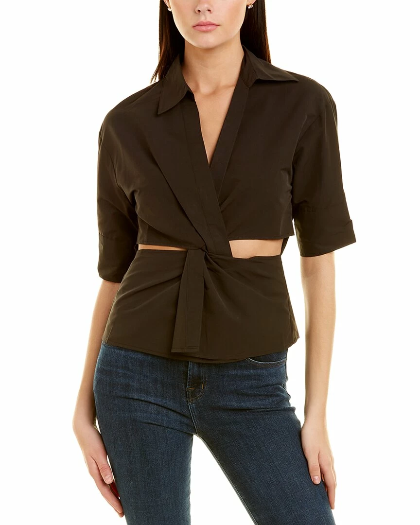 - Collared Twisting Point Top In Black With Cutouts At Waist And Elbow-Length Sleeves