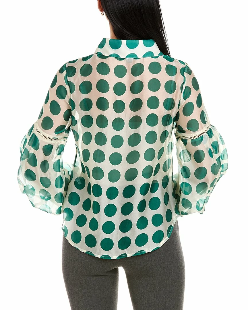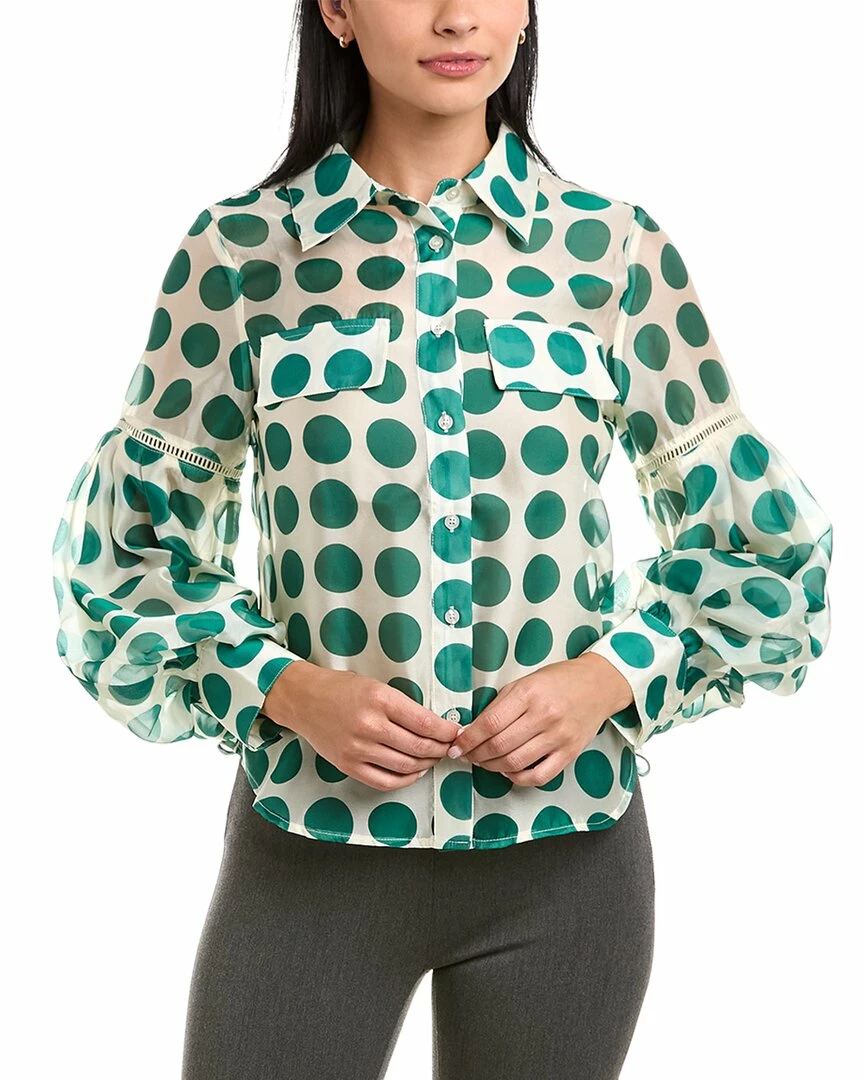 - Dot Top In Green With Semi-Sheer Fabric, Spread Collar, Dual Chest Pockets, Puff Sleeves With Lace Detailing And Button Cuffs