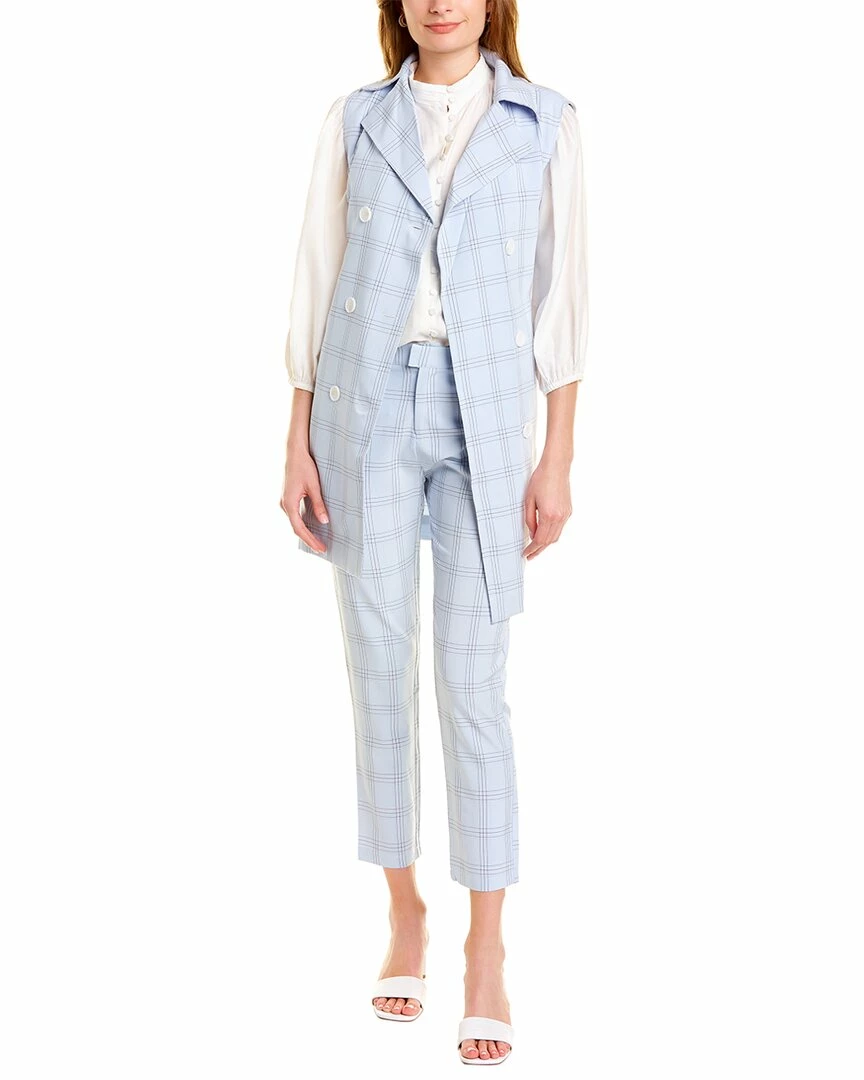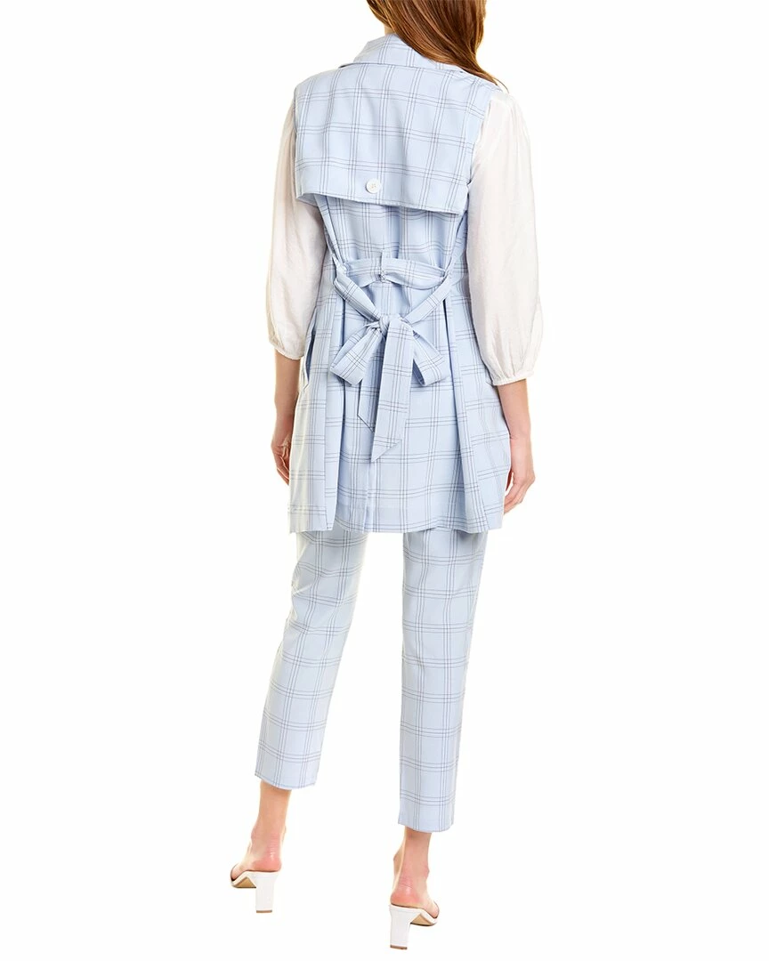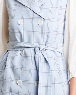 - Double-Breasted Jacket In Blue Plaid With Storm Panel At Back Yoke, Two Front Pockets, Tie Sash At Waist, And Center Vent At Back Hem