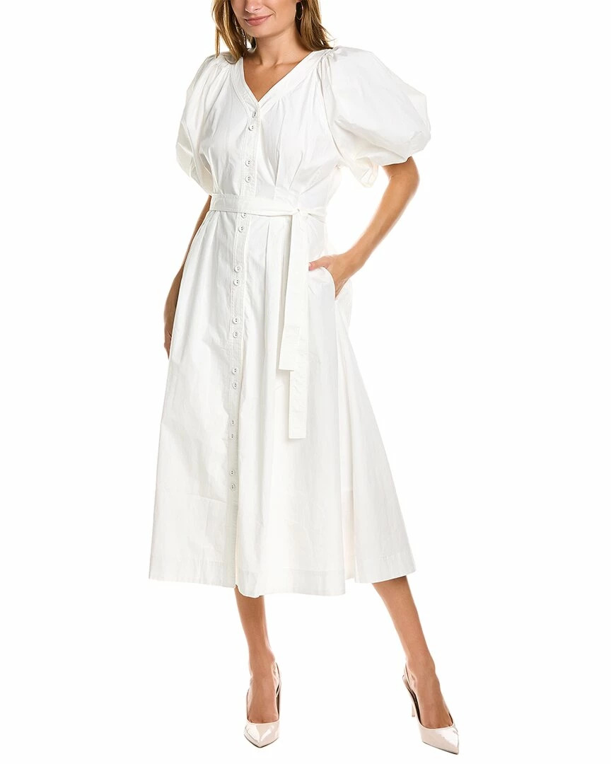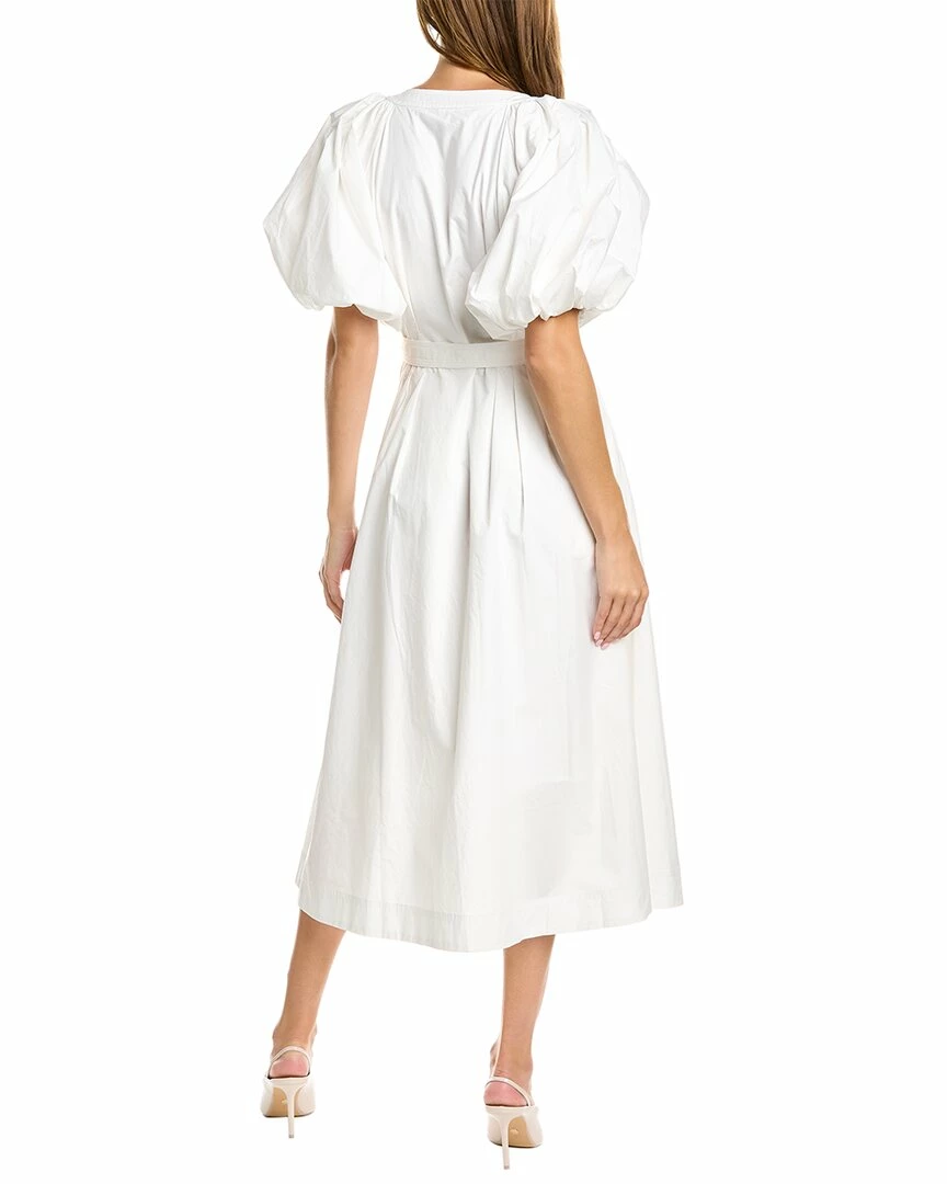 - Exaggerated Balloon Sleeve Shirtdress In White With Pleated Detailing, Side Seam Pockets, And Tie-Sash At Waist