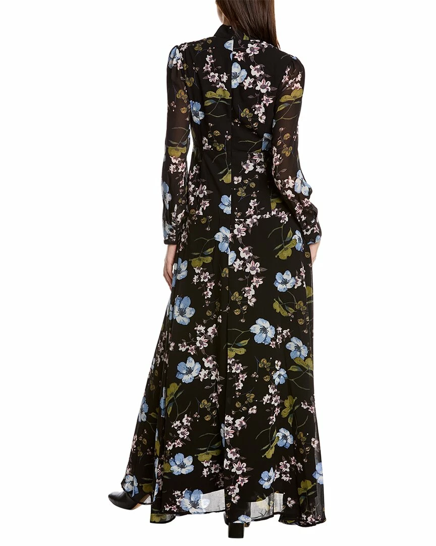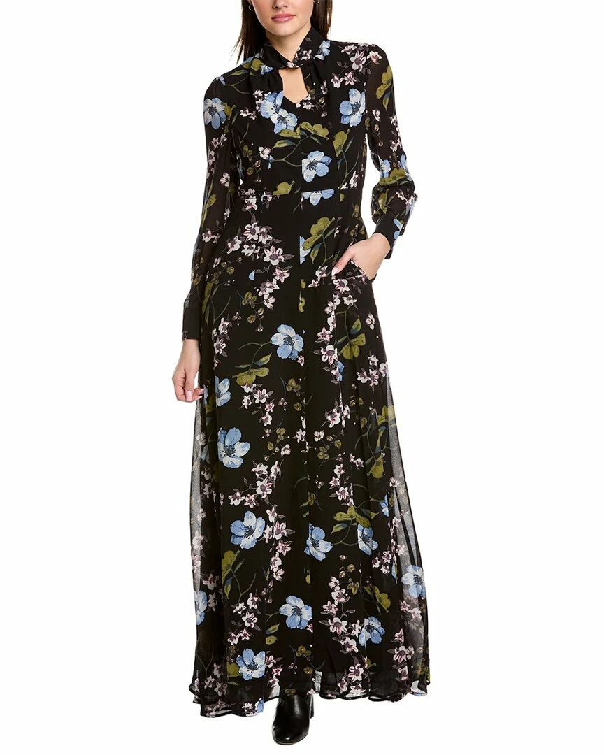 - Floral Maxi Dress In Black With Twisted Mock Neck, Keyhole Cutout, Pleated Bodice Detailing, And Side Seam Pockets
