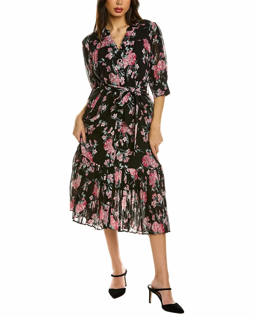 - Floral Shirtdress In Black Multicolor With Elbow-Length Sleeves, Button Cuffs, Gathered Back Yoke, Side Seam Pockets, Tie Sash At Waist, And Pleated Hem