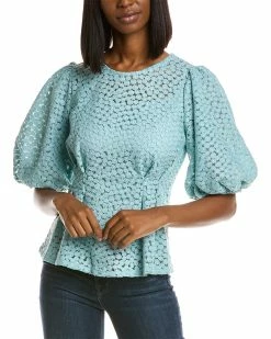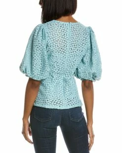 - Flower Embroidered Top In Mint With Elbow-Length Balloon Sleeves