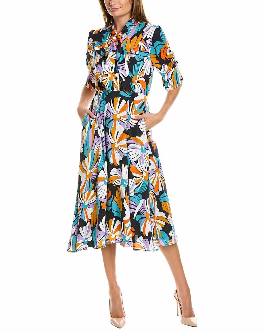 - Flower Print Midi Dress In Purple Multicolor With Tie Neck, Elbow-Length Sleeves, Ruffle Trim, And Side Seam Pockets