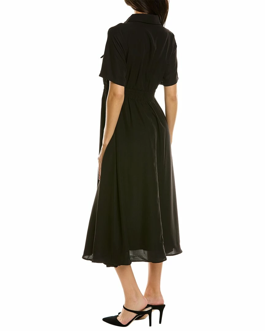 - Front Zip Midi Dress In Black With Faux Chest Pockets, Elasticized Waistband, And Side Seam Pockets