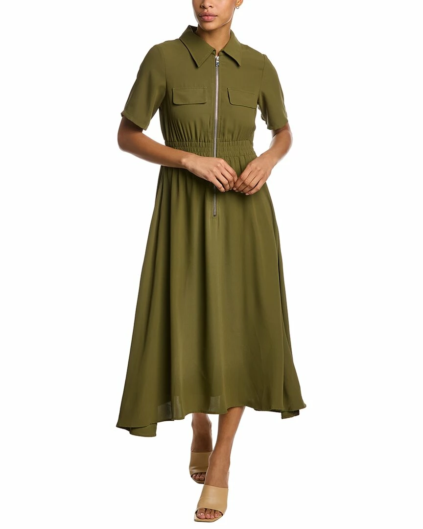 - Front Zip Midi Dress In Olive With Faux Chest Pockets, Elasticized Waistband, And Side Seam Pockets