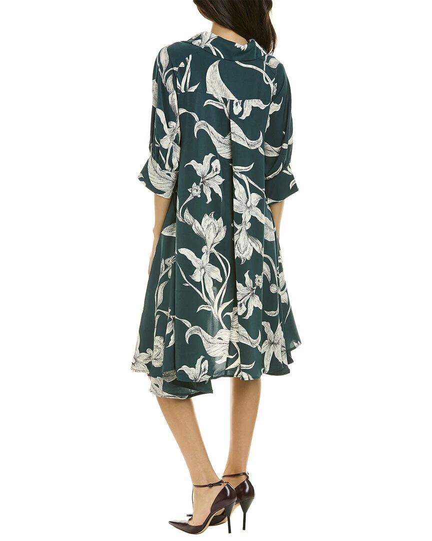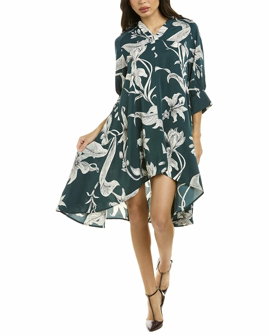 - Handkerchief A-Line Dress In Green With Elbow-Length Sleeves, High-Low Hem, And Two Front Pockets