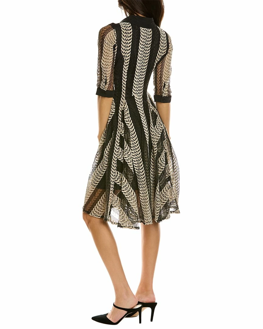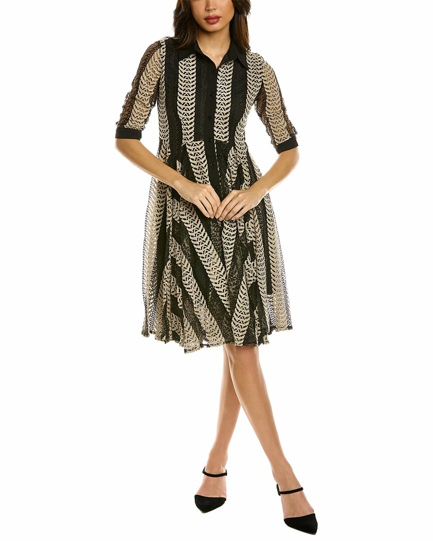 - Lace Shirtdress In Black And Beige With Velvet Lace Panels And Elbow-Length Sleeves