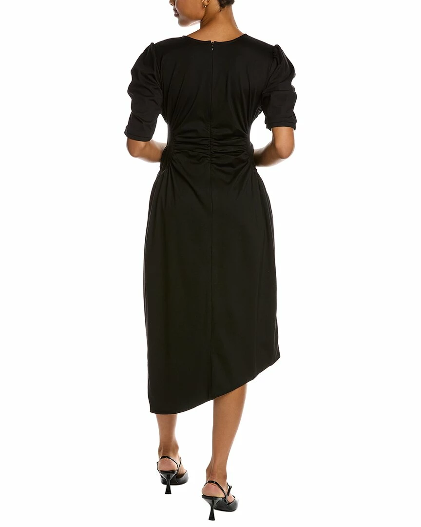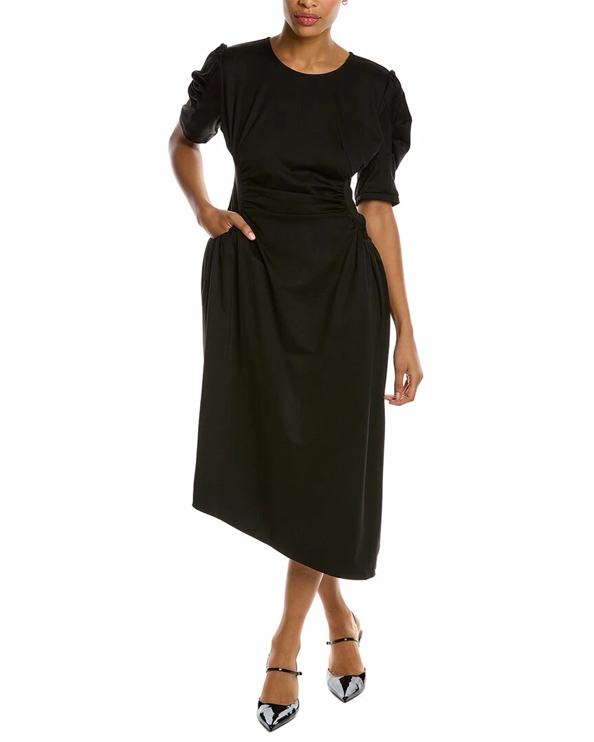 - Midi Dress In Black With Ruched Waist And Draped Side Pockets