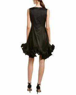 - Midi Dress In Black With Pleated Skirt, Mock Neck, Button Cuffs, Elasticized Waist, And Belted Waist