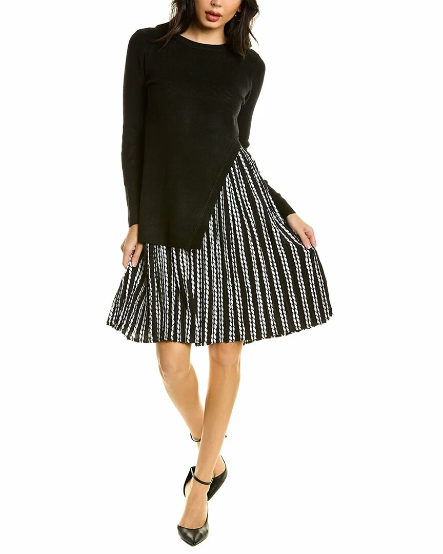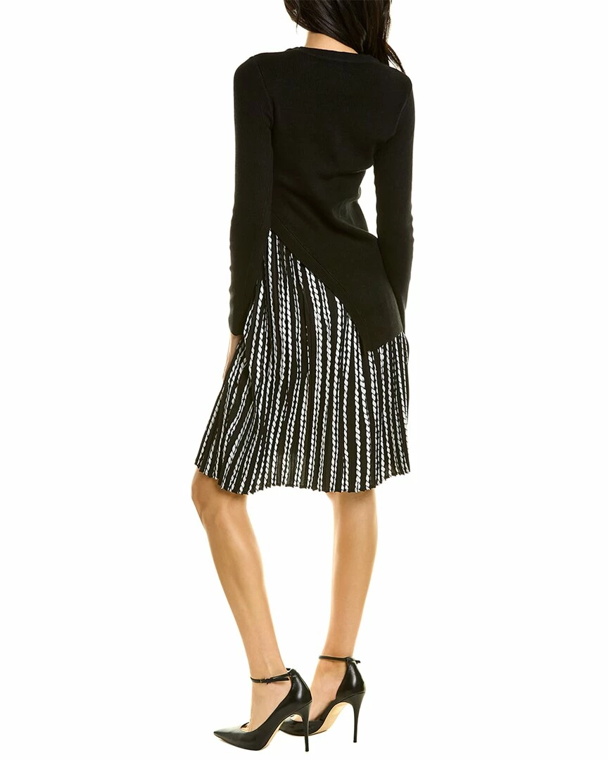 - Mixed Media Mini Dress In Black With Ribbed Contrast Bodice, Asymmetrical Upper Hem, And Pleated Underskirt