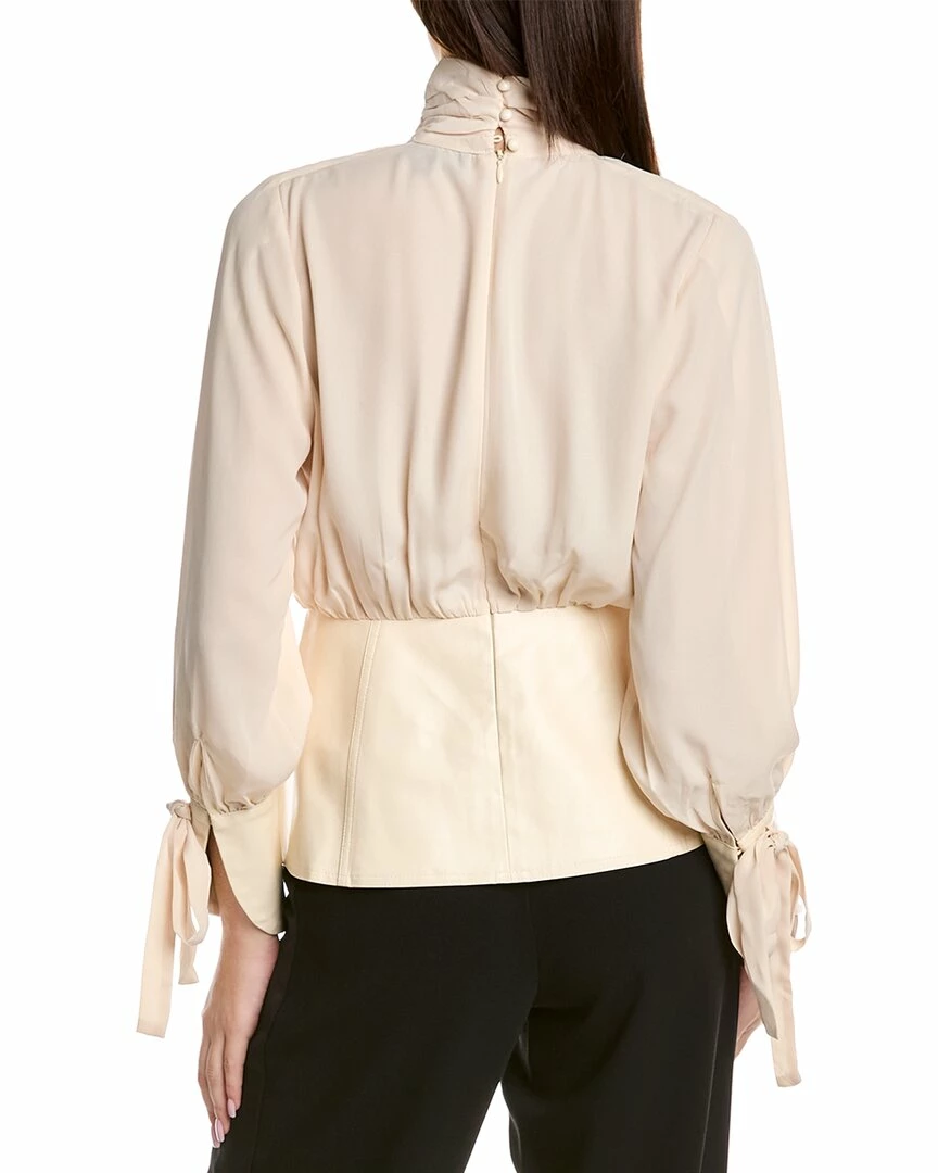- Peplum Top In Beige With Twisted Mock Neck, Keyhole Cutout, Faux Leather Trim, And Tie-Cuffs