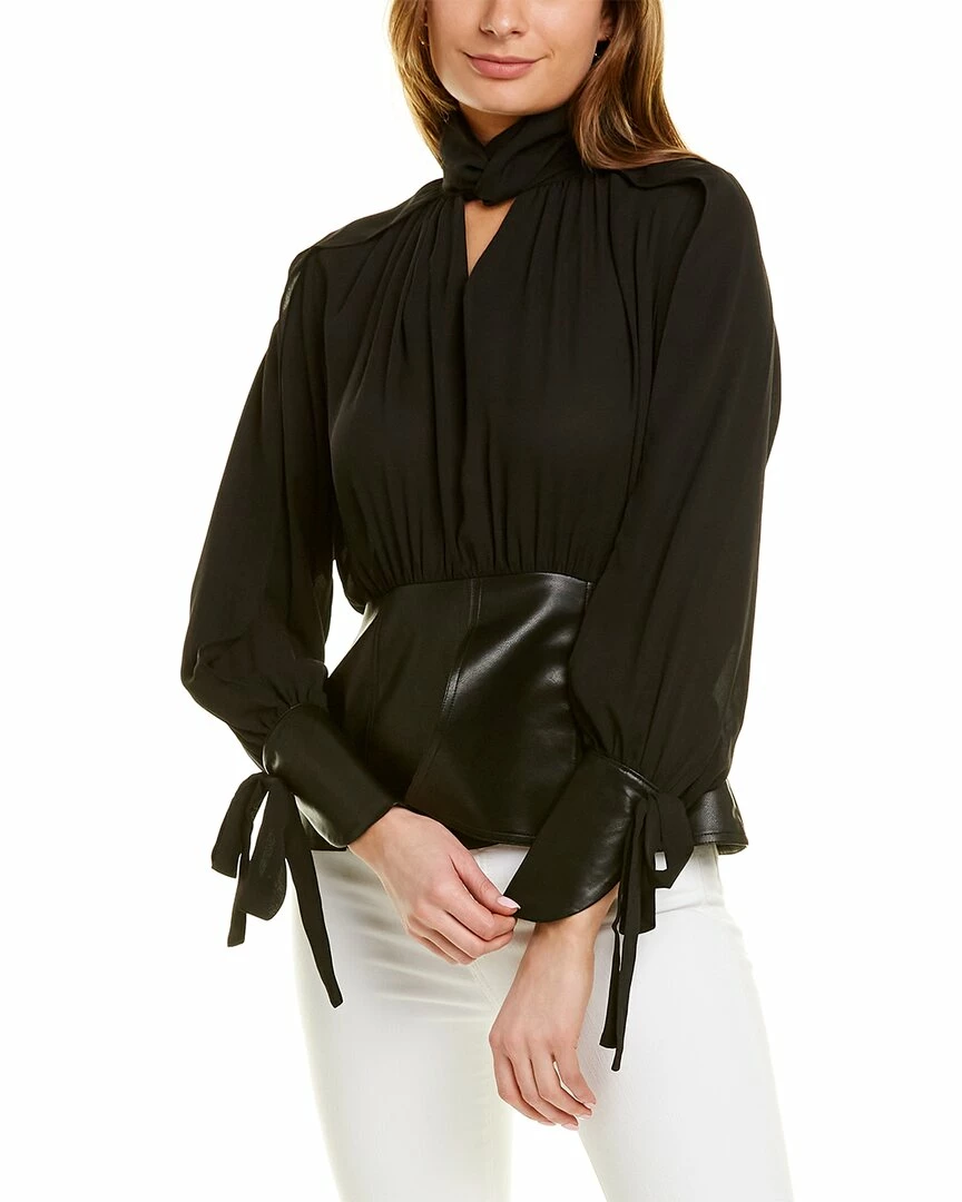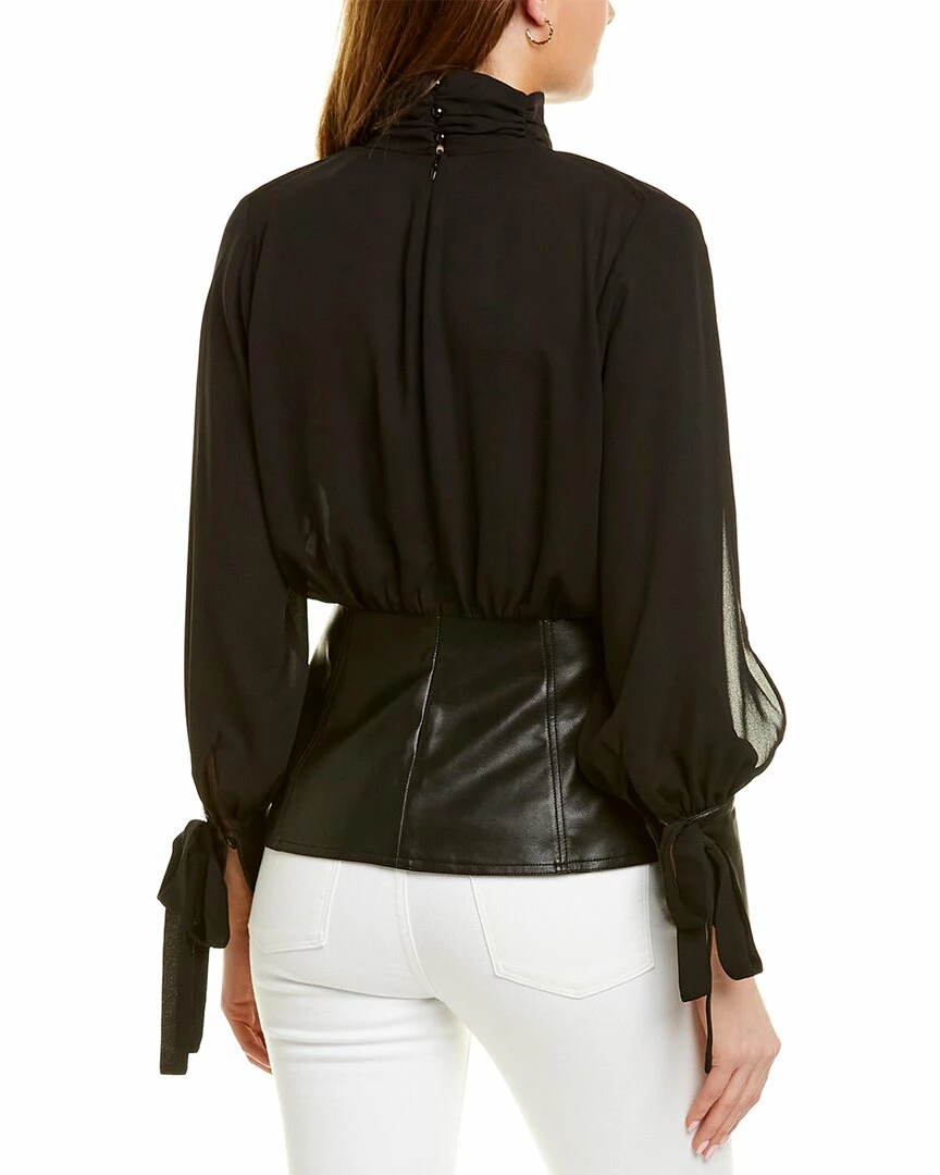 - Peplum Top In Black With Twisted Mock Neck, Keyhole Cutout, Faux Leather Trim, And Tie-Cuffs