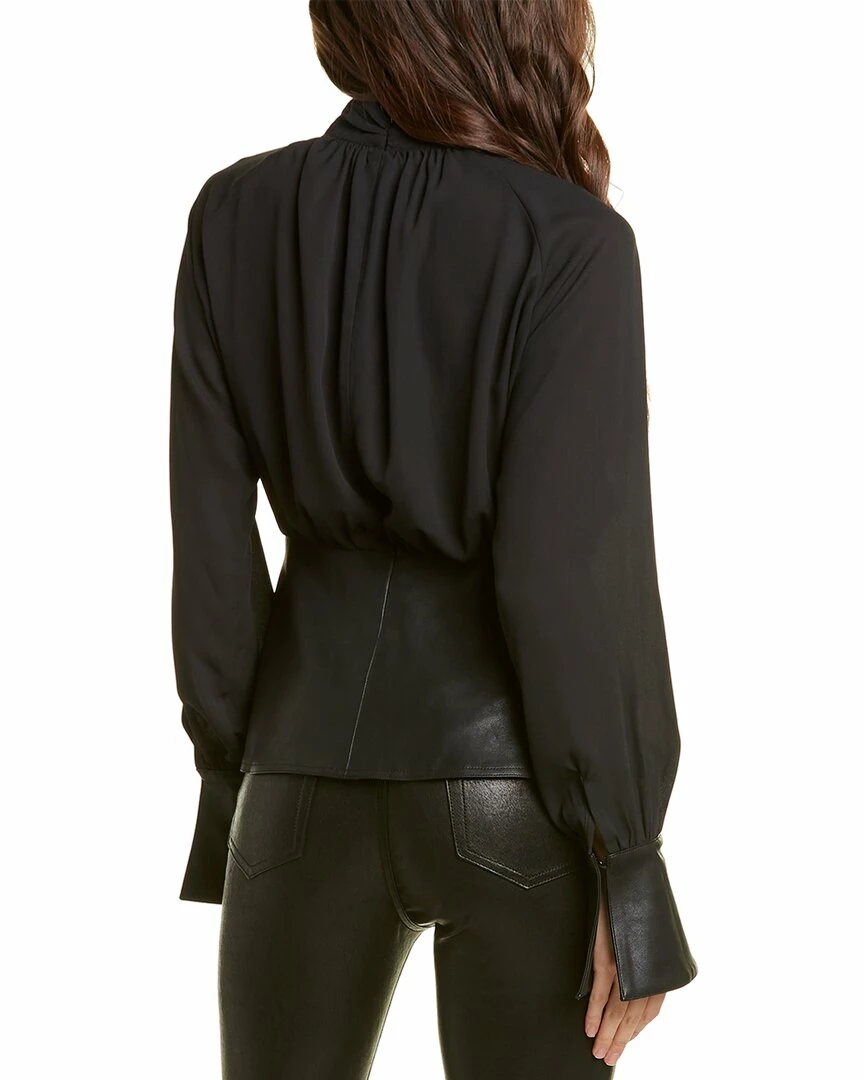 - Peplum Top In Black With Ruched Mock Neck, Keyhole Cutout, Faux Leather Cuffs And Hem, And Front Slit