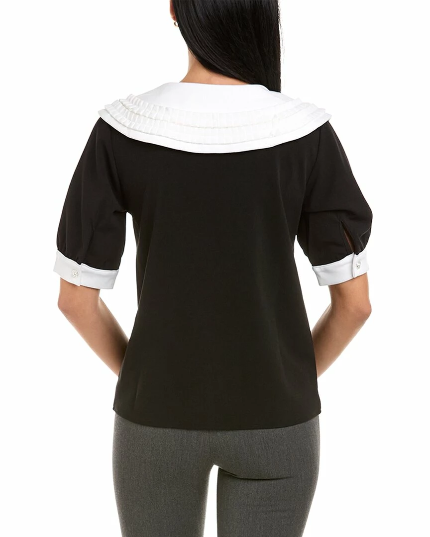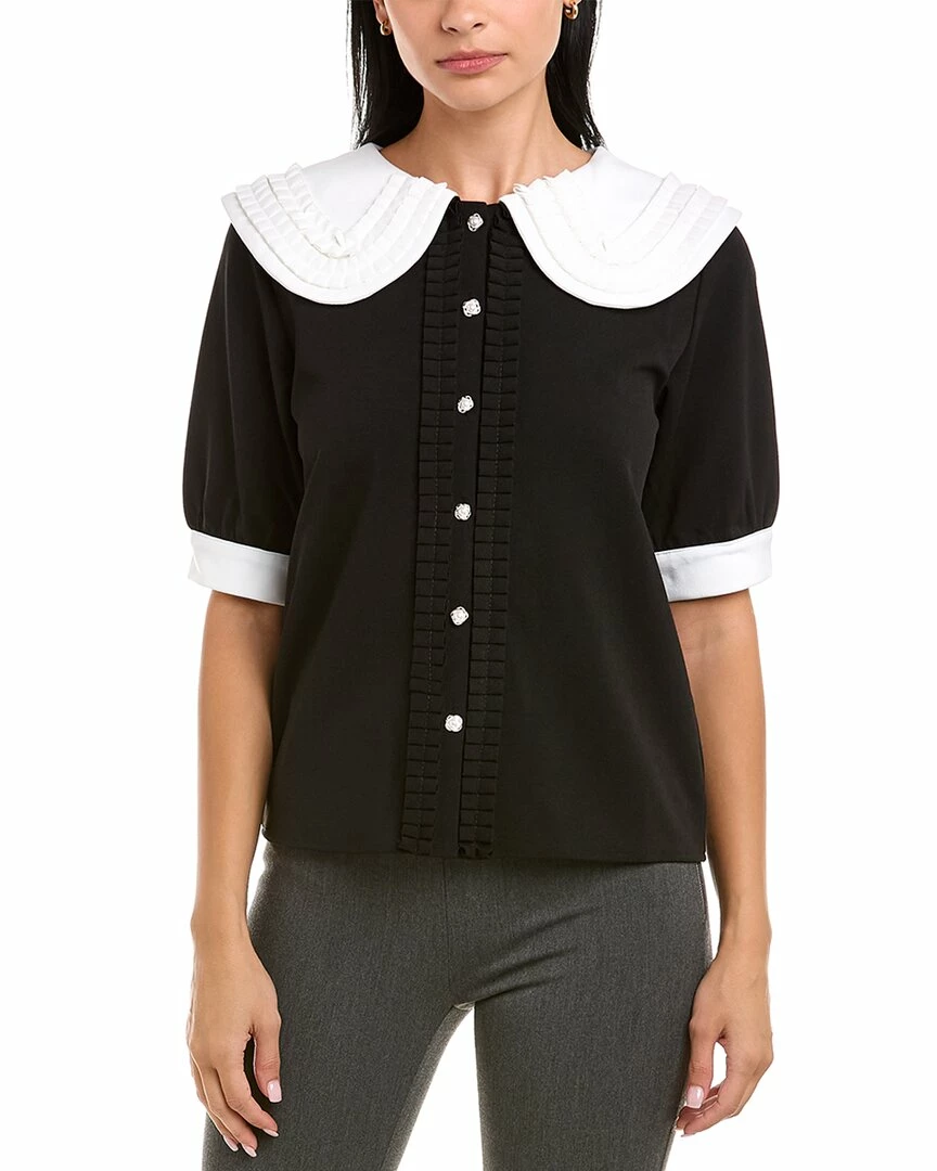 - Peter Pan Collar Top In Black/White With Oversized Ruffled Peter Pan Collar, Contrast Button Cuffs, Ruffle Front And Pearl Buttons