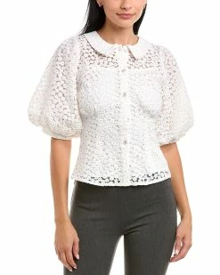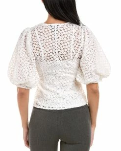 - Peter Pan Top In White With Embroidered Lace Design, Elbow-Length Balloon Sleeves, And Inner Cami