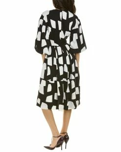 - Pleated Balloon Sleeve Midi Dress In Black And White With Side Seam Pockets And Pleated Skirt