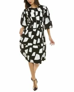 - Pleated Balloon Sleeve Midi Dress In Black And White With Side Seam Pockets And Pleated Skirt