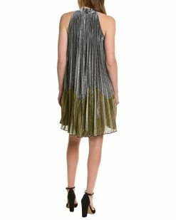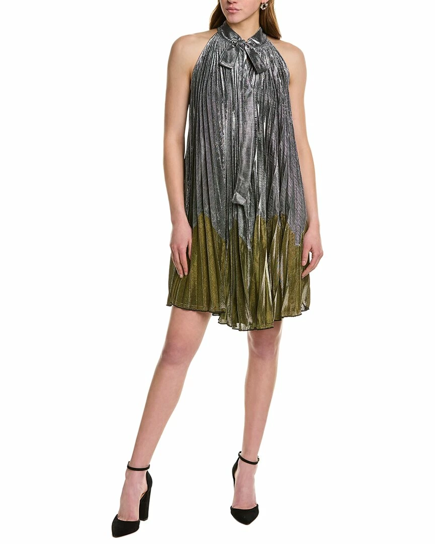 - Pleated Trapeze Dress In Silver With Halter Style And Self Tie At Neck