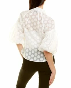 - Polka Dot Paneled Top In White With Sheer Design, Elbow-Length Balloon Sleeves, And Stand-Up Collar