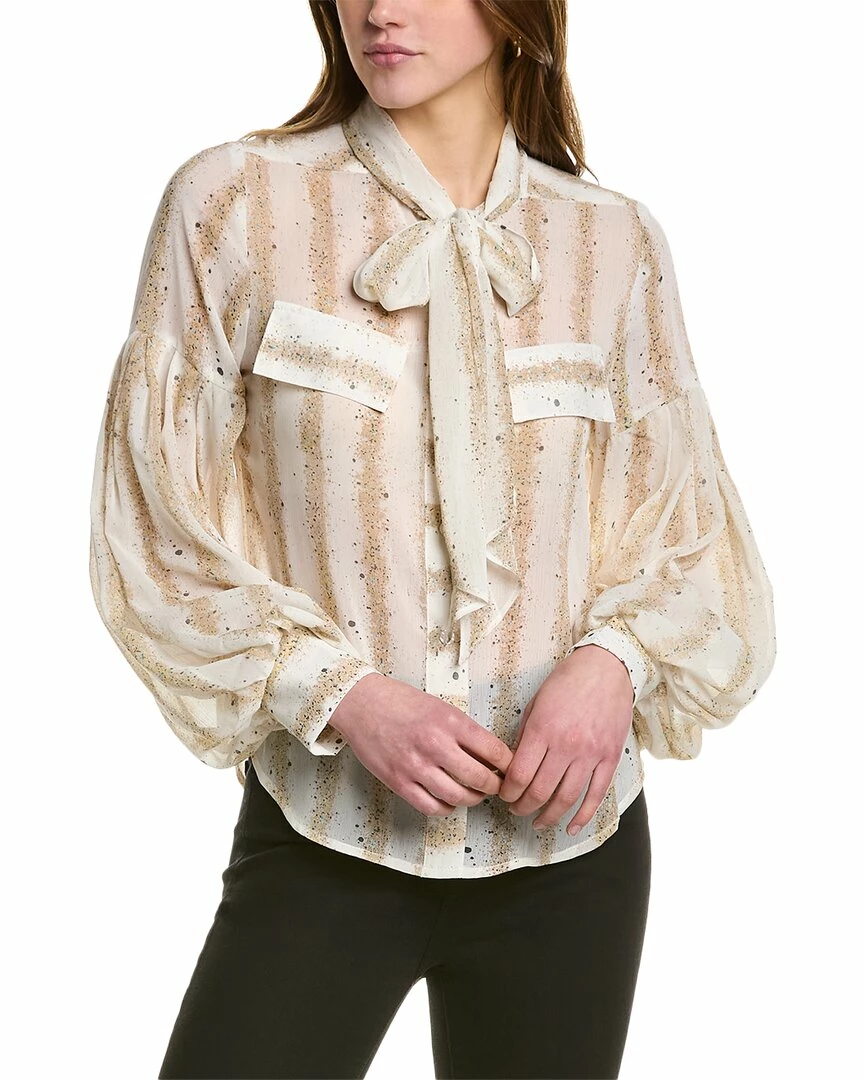 - Puff Sleeve Blouse In White With Decorative Faux Pockets At Chest, Tie At Neck, Dropped Shoulder Sleeves, And Button Cuffs