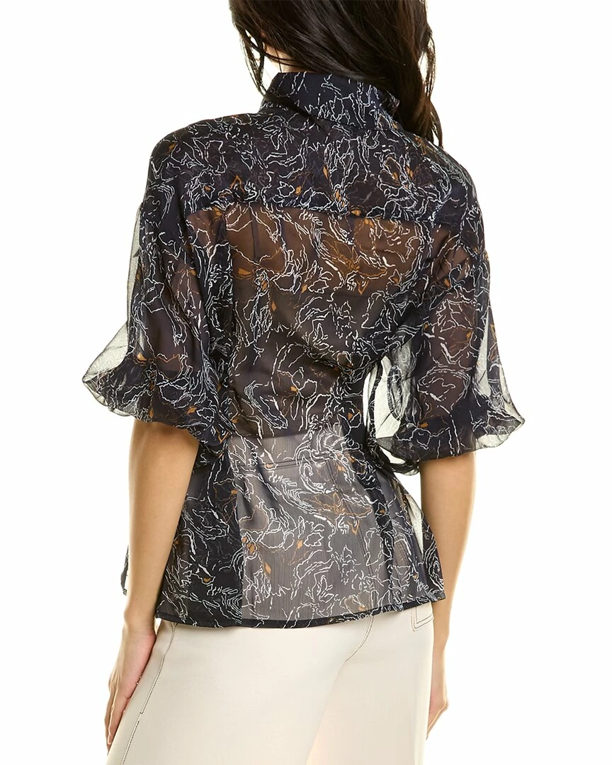 - Puff Sleeve Sheer Top In Navy With Elbow-Length Sleeves