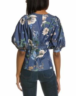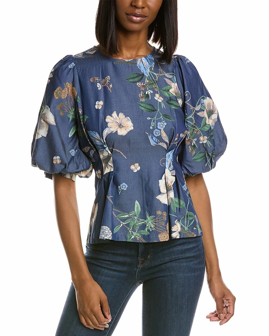 - Puff Sleeve Top In Denim Blue With Puffed Sleeves And Pintucked Waist
