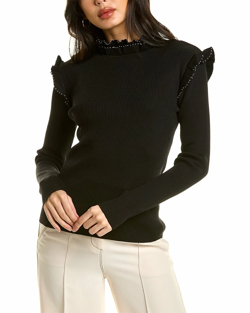 - Ruffle Hem Top In Black With Ribbed Design And Beaded Accents