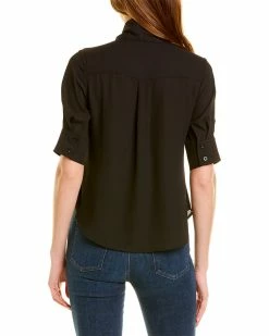 - Scarf Neck Top In Black With Ladder Stitch Trim, Elbow-Length Sleeves, And Box Pleat At Back