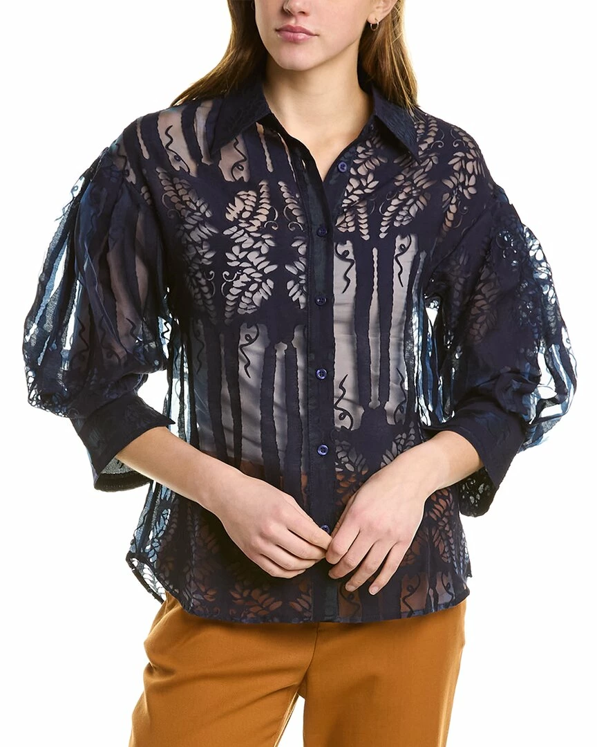 - See-Through Flower Top In Navy With 3/4-Length Sleeves And Mesh Yoke