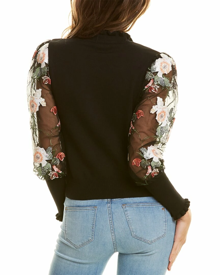 - Sequin Sweater In Black/Beige With Ruffle Collar And Cuffs, Embroidered Sleeves With Sequin Embellishments And Ribbed Trim
