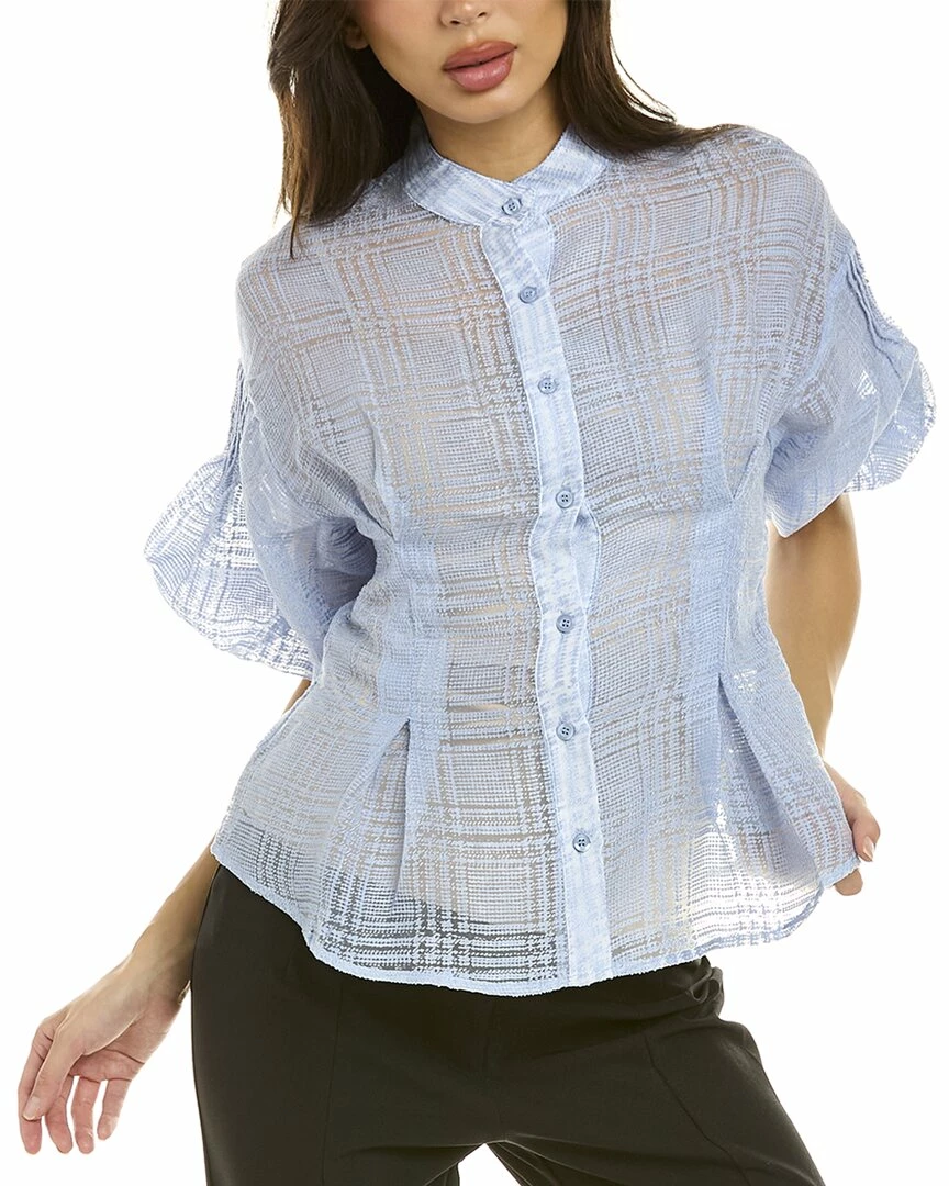 - Sheer Banded Collar Puffed Sleeve Top In Light Blue With Sheer Design, Band Collar, Pleated Detailing And Puff Sleeves