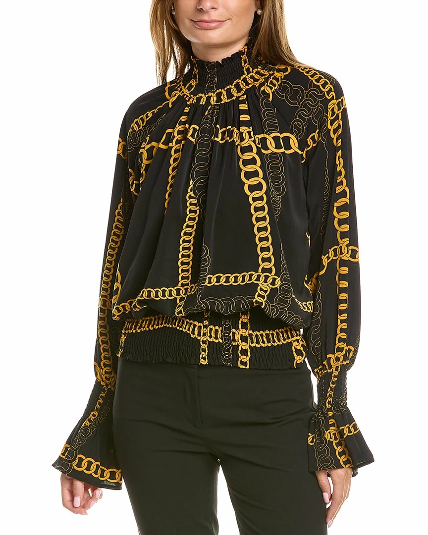 - Shirring Detail Chain Print Top In Black And Gold With Smocked Mock Neck And Hem, And Flounce Cuffs