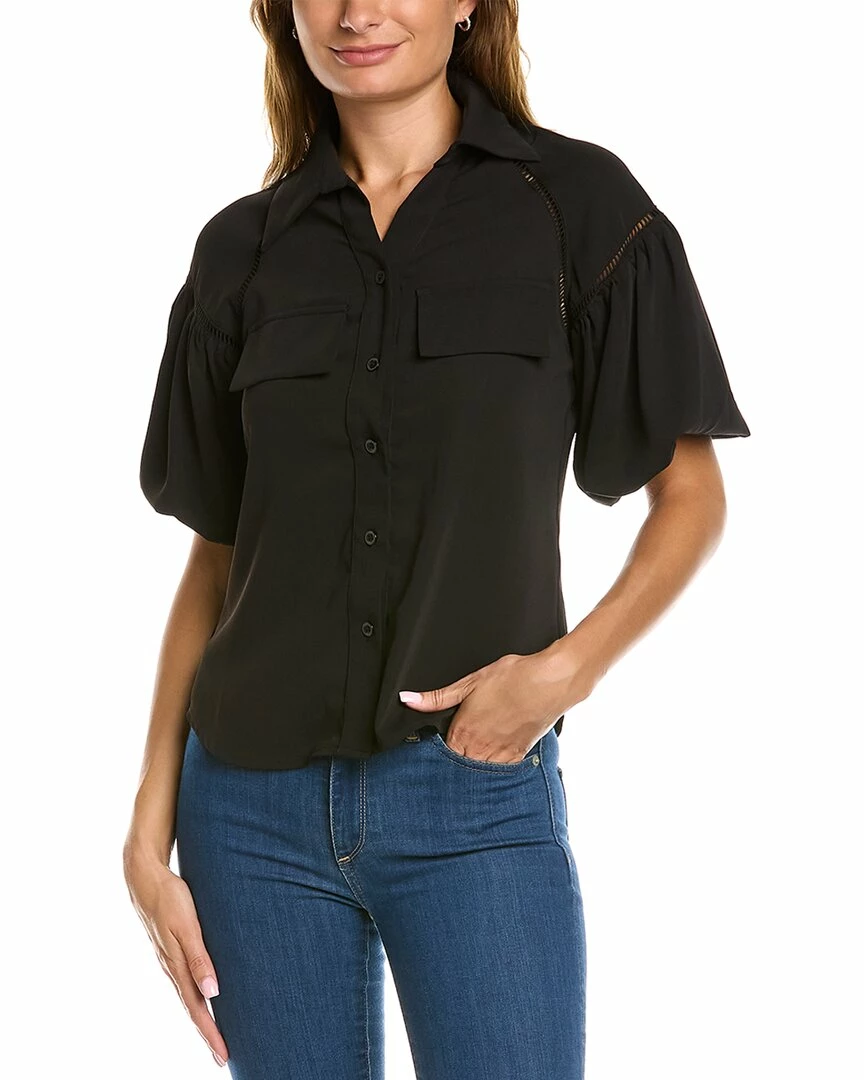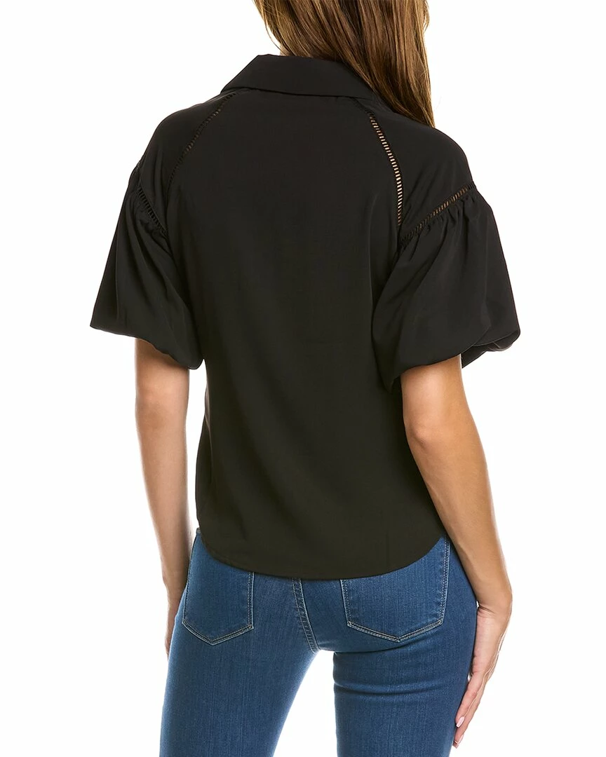 - Solid Collared Top In Black With Dual Chest Pockets, Puff Sleeves, And Ladder Stitch Trim