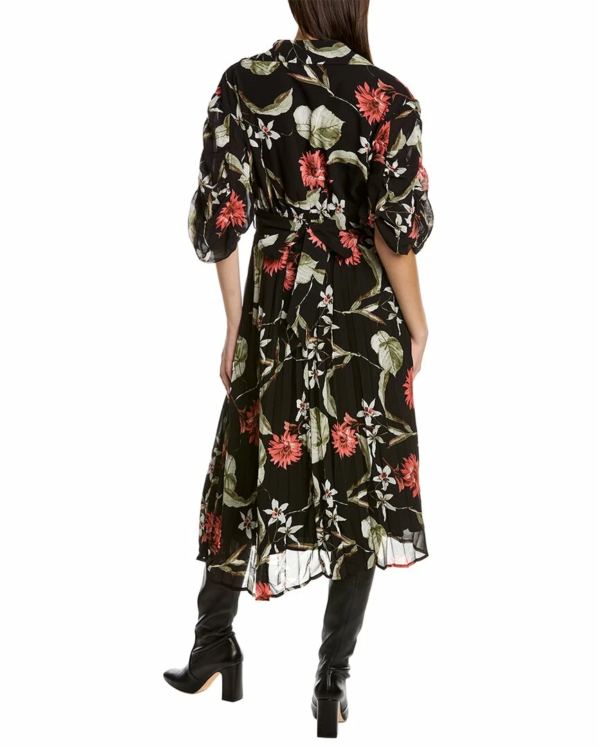 - Surplice Midi Dress In Black With Ruched Elbow-Length Sleeves, Elasticized Waist, Tie Sash, And Accordion Pleated Skirt