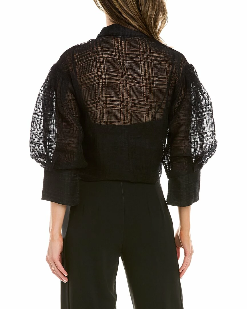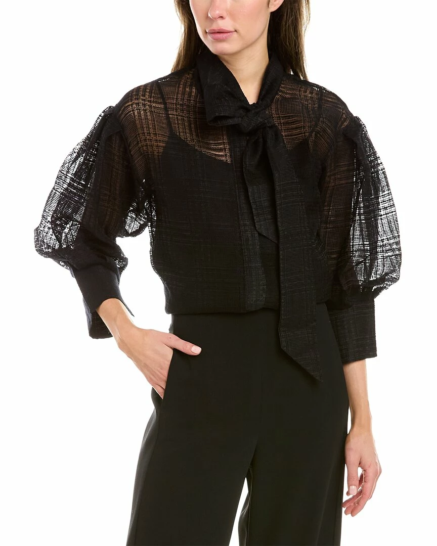 - Tie-Neck Balloon Sleeve Top In Black With Sheer Burnout Design, Self-Tie Neck Sash, Gathered Puff Sleeves With Split Cuffs And Curved Hem