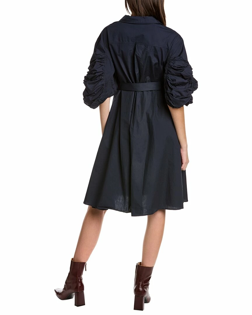 - Tie Waist Shirtdress In Navy With Ruched Sleeves And Side Seam Pockets