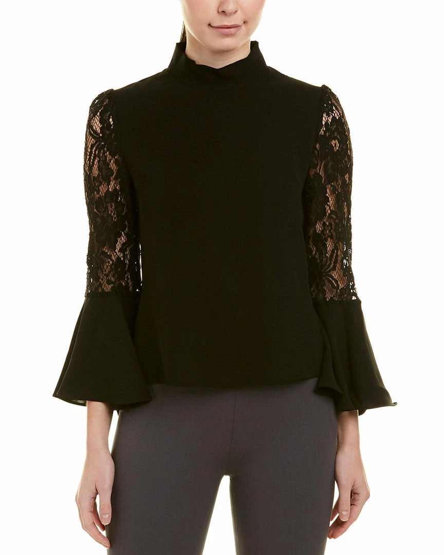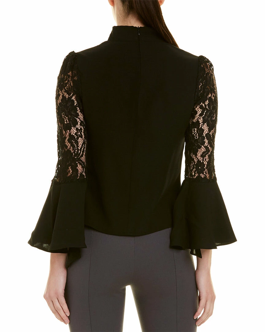 - Design Details – Mock Neck, Sheer Lace Bell-Sleeves