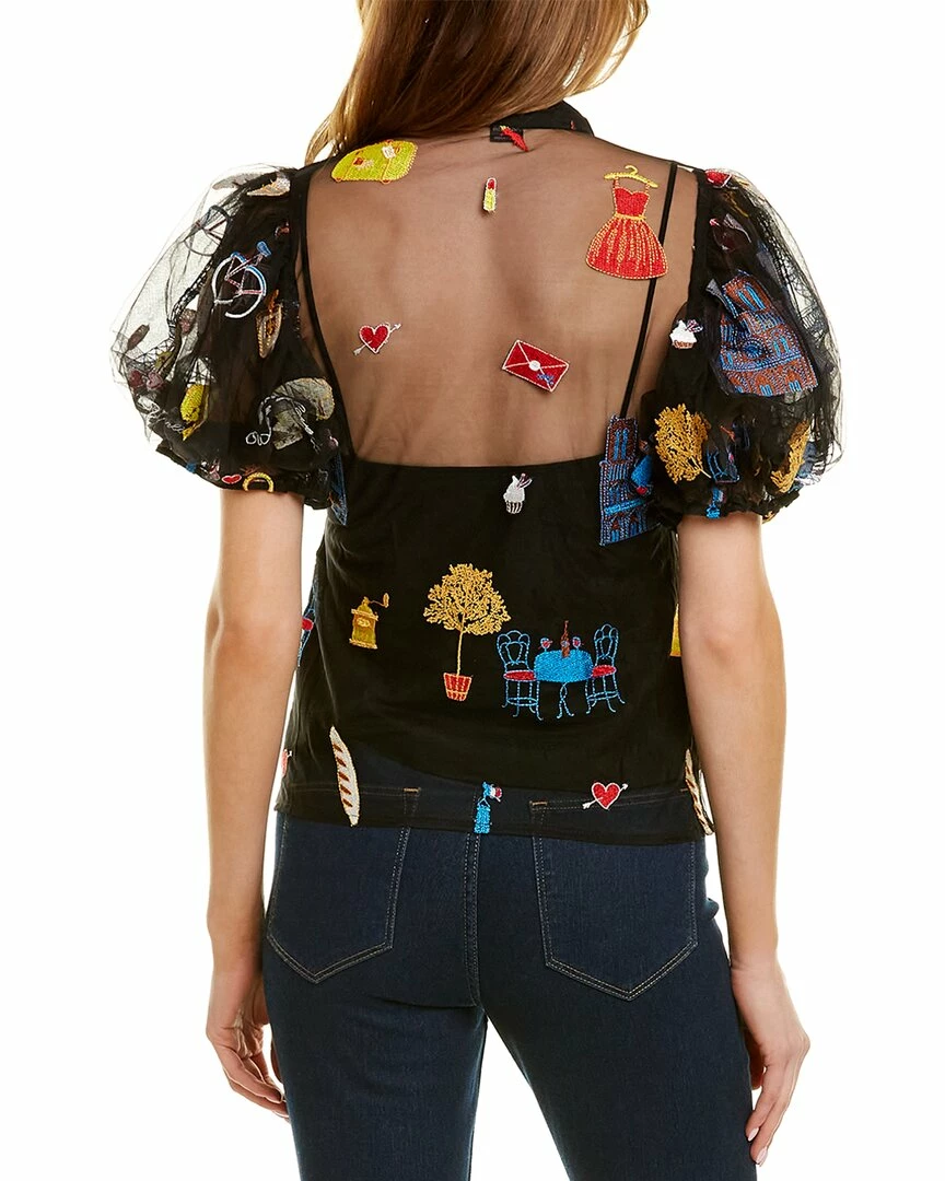 - Design Details – Sheer Mesh Design With Embroidered Detailing; Short Puff Sleeves; Bow Detail At Neck
