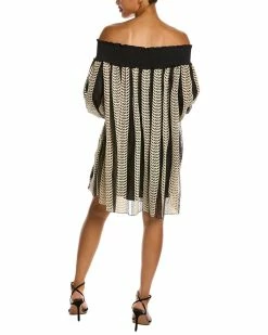 - Tunic Dress In Black And Beige With Smocked Off-The-Shoulder Style, Velvet Lace Design, And Balloon Sleeves