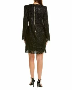 - Tweed V-Neck Sheath Dress In Black With Button Accents And Fringe Trim