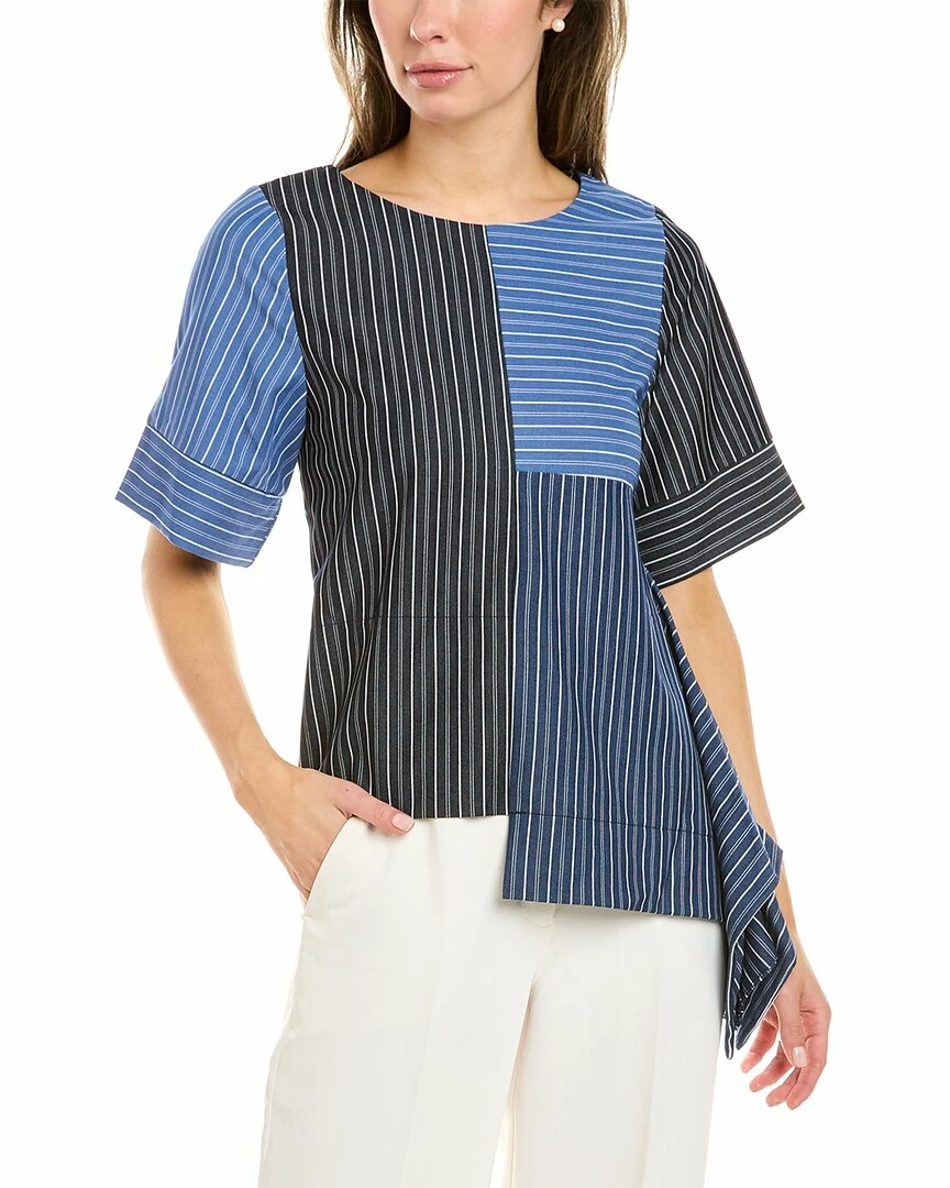 - Unbalanced Hem Top In Blue With Patchwork Design And Draped Asymmetrical Hem