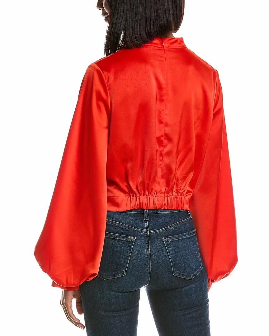 - Wide Sleeve Top In Orange With Metal Charm Detail At Collar, Balloon Sleeves, Twisted Front Hem And Elasticized Back Hem