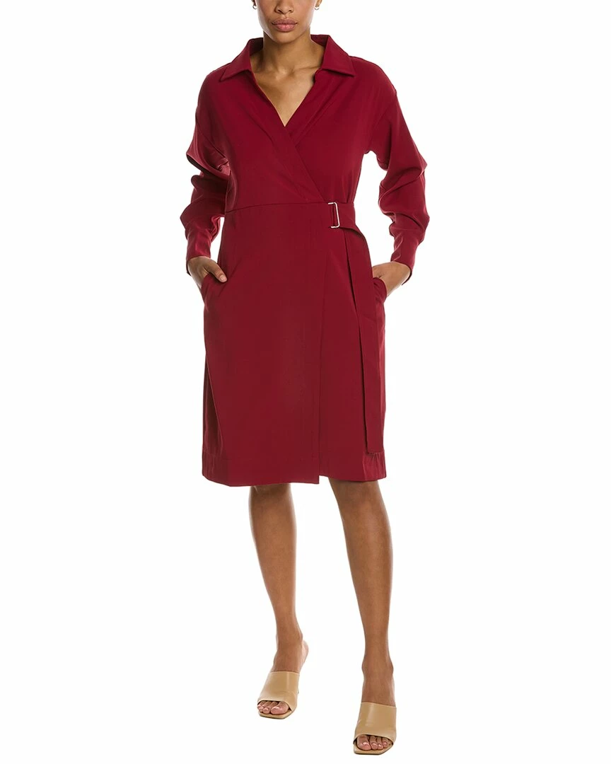 - Wrap Dress In Dark Red With Collared Neck, Shirred Back, Buckle Wrap Waist, And Side Slip Pockets